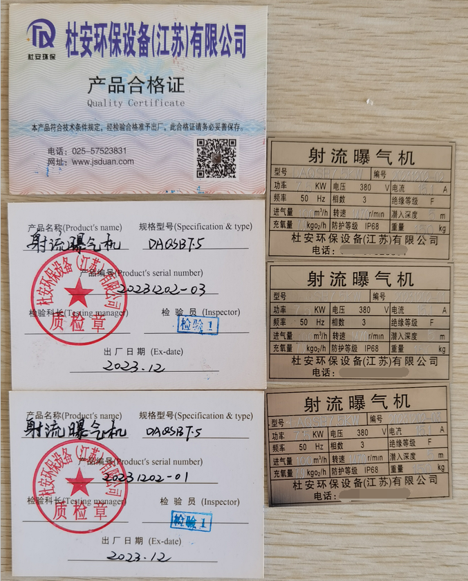 (6)潜水曝气机电机设备通过改变方立柱上分度盘的插销孔位,即可在120°的范围内调节方向。起吊架可360°旋转,能方便地将主机起落在安装平台上。可吊放主机,也可将曝气机提升至水上进行维护、保养。采用电动卷绕装置,设有自锁机构,提升链采用不锈钢钢丝绳,螺栓、螺母、垫圈采用不锈钢材质。