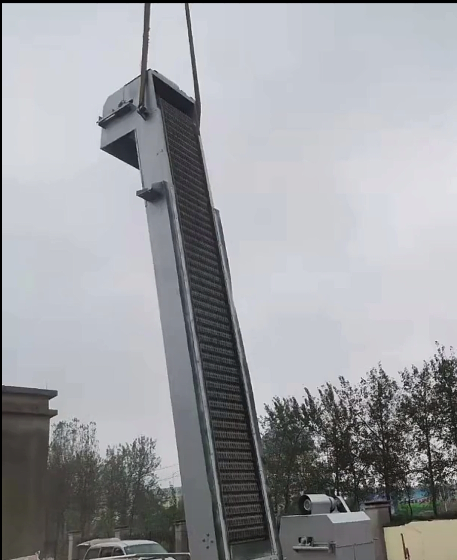 驱动电机安装在机架侧向的输出轴上,齿耙在二侧传动链条的带动下,犁形齿耙自下而上将整个渠道宽度范围内的污物向上提取,抵达上部时,通过导轨及链轮的转向动能,自动完成卸污工作。
